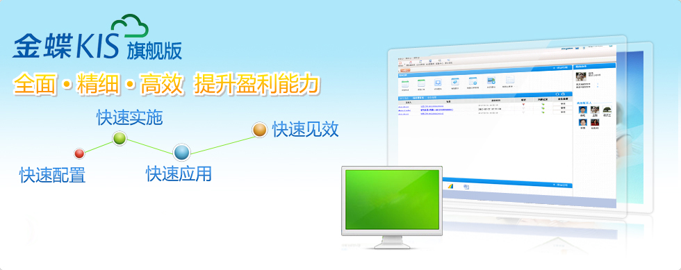 金蝶KIS旗艦版,模塊功能傳承K/3 RISE穩(wěn)定成熟的品質(zhì),完美融合KIS品牌簡(jiǎn)約易用的極致體驗(yàn),是金蝶專為小微企業(yè)精心打造的明星產(chǎn)品。系統(tǒng)充分滿足小型工貿(mào)、商貿(mào)企業(yè)規(guī)范內(nèi)部管理的信息化需求,同時(shí)基于成功客戶應(yīng)用實(shí)踐結(jié)合對(duì)未來(lái)市場(chǎng)趨勢(shì)的前瞻性分析,提供創(chuàng)新的電商、移動(dòng)及社交化整合解決方案,幫助小企業(yè)高效構(gòu)建以客戶為中心的全員業(yè)務(wù)協(xié)作能力。