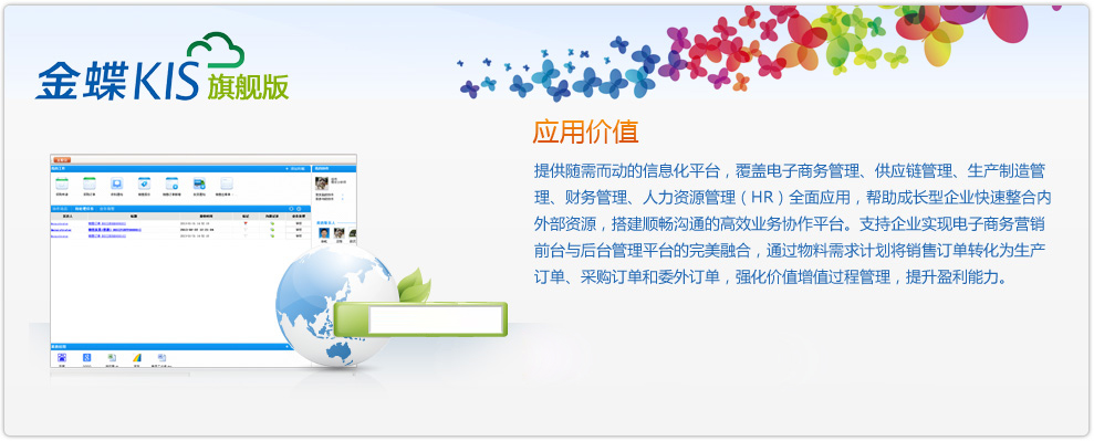 金蝶KIS旗艦版,覆蓋電子商務(wù)、供應(yīng)鏈、生產(chǎn)制造、財(cái)務(wù)、人力資源管理全面應(yīng)用,幫助企業(yè)高效整合內(nèi)外部資源。